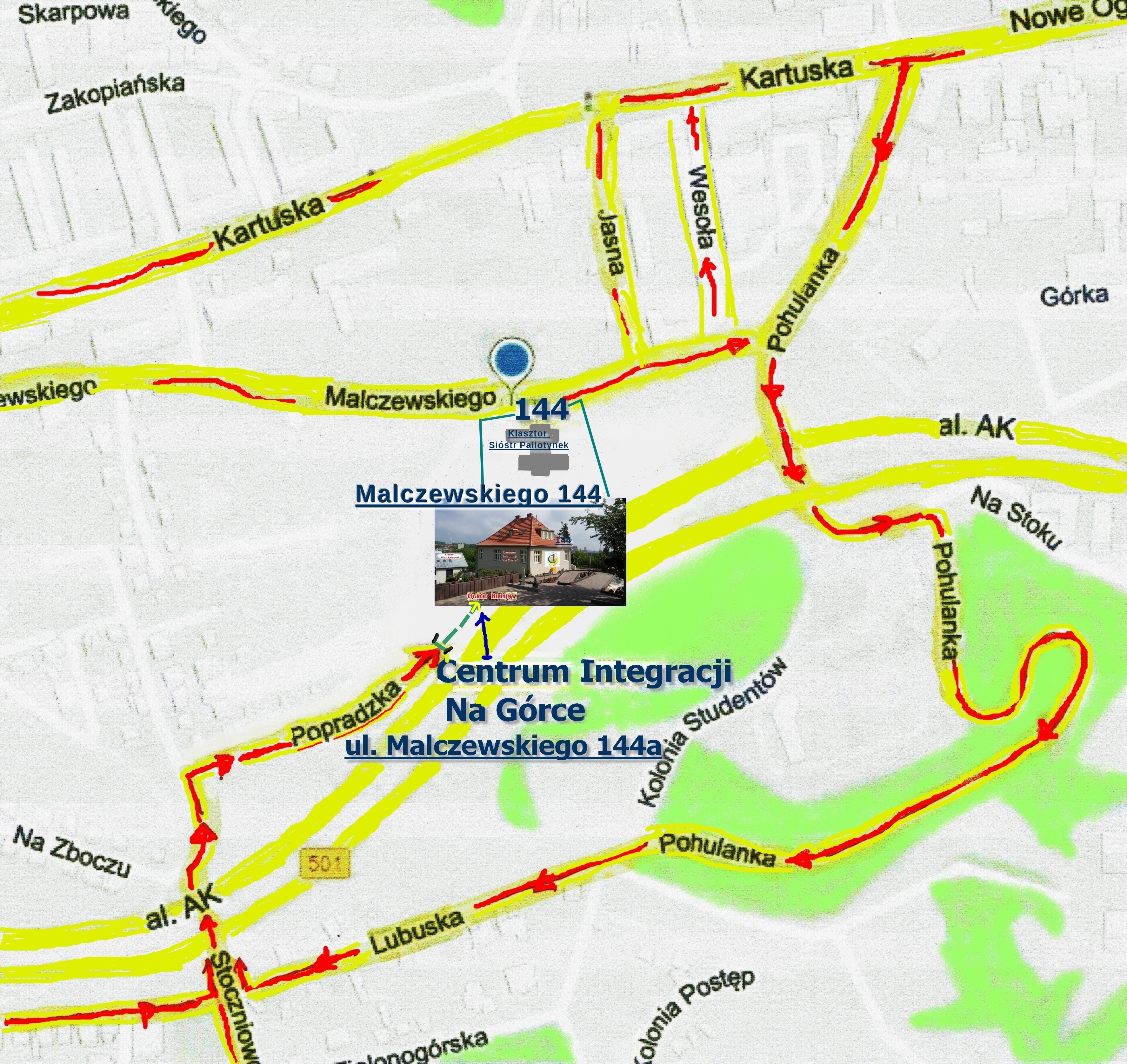 Dojazd kołowy do Centrum Integracji "na Górce" od strony ul. Popradzkiej. GPS należy nastawić na ul. Malczewskiego 135B/8, a po osiągnięciu tego celu należy jechać dalej aż do bramy wjazdowej do Centrum Integracji, na końcu ul. Popradzkiej.